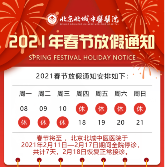 停诊时间定于2021年2月11日—2月17日,农历正月初七(2月18日)正常接诊。如有不便,敬请谅解!